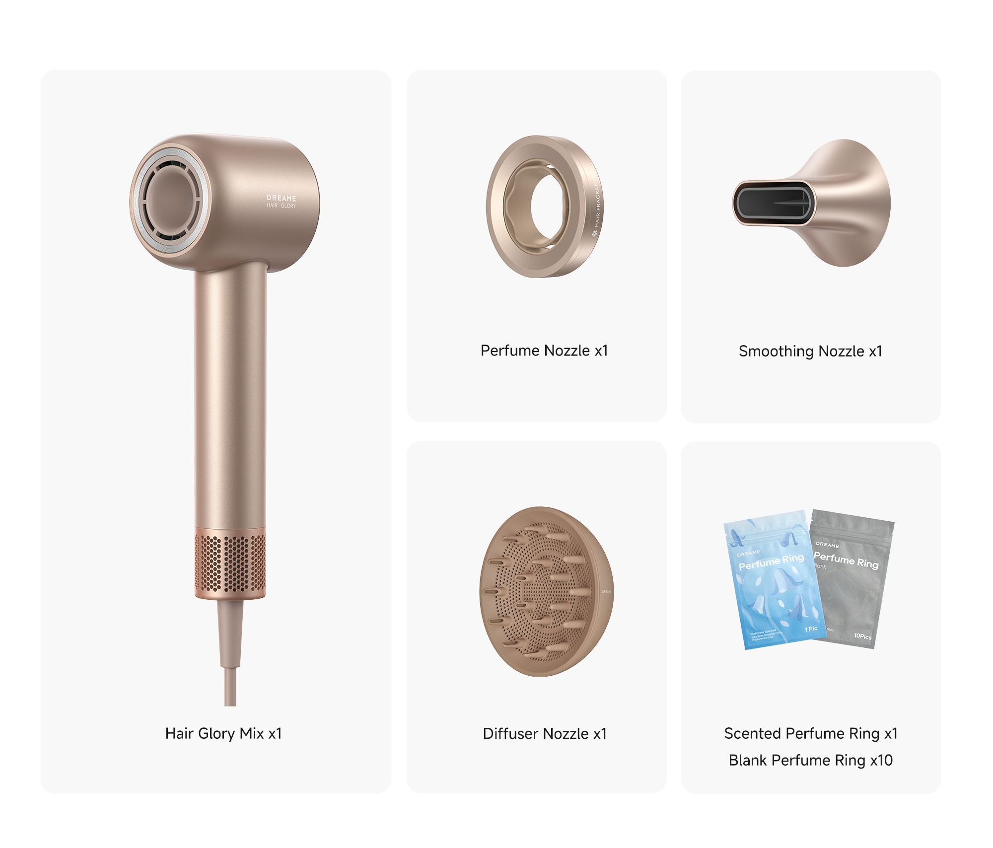 The Perfume Nozzle adds a lasting fragrance. The Diffuser defines curls, while the Smoothing Nozzle tames frizz for a sleek look